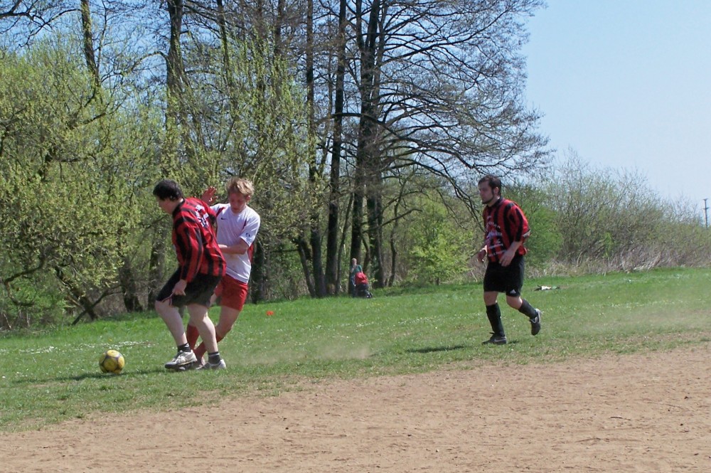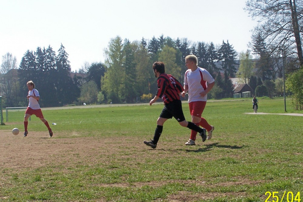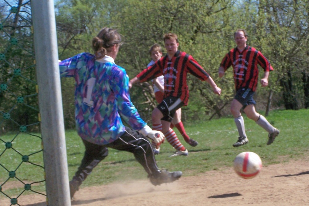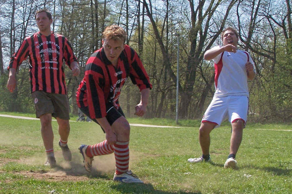 Mit Nichten! Prompt nun mit dem Mut der Verzweiflung, warf alles nach vorne und hatte hinten Glück, als Montalto nach einer schönen Kombination über Fabi und Brandl den Querpass in die Füße des Gegners schlug. Nun war noch mal Keeper-Kempe und die vielbeinige Abwehr um Winter, Nafets und Schubi gefragt! Nur einmal noch verlor Kempe den Überblick, doch kein Prompter war in der Nähe um den vergessenen Ball über die Linie zu schieben. Plötzlich traf schwarz-orange aus dem Gewühl heraus zum 3:4… Kempe schuldlos. Jetzt wurde es noch mal Ernst! Quasi mit dem Schlusspfiff noch mal ein wuchtiger Schuss aufs Bimbela-Gehäuse, doch Hab-ich-Kempe war zur Stelle! Das war der wichtigste, alles vorher damit vergessen! 🙂