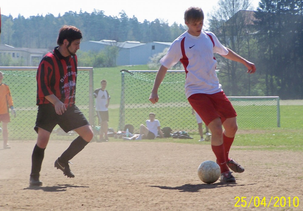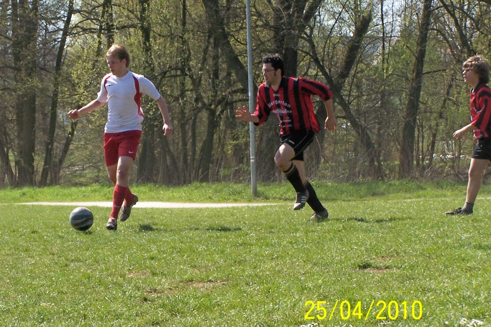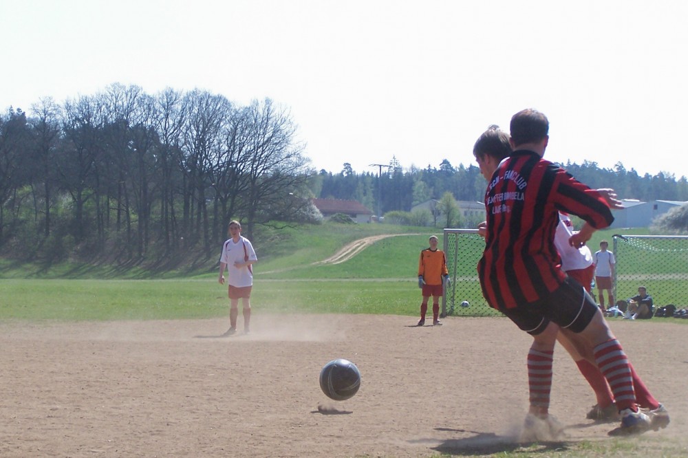Aber Prompt kam nun stärker, unsere Entlastungskonter wurden seltener. Bis die Bimbela erkannten, dass sie den Kampf annehmen müssen, den die einsatzfreudigen Daneben-Jungs in die Waagschale legten, lag man durch einen Doppelschlag schon zurück: Nach einem halbhohen Querpass hatte Brandl Gegenspieler Eiche im Griff, aber am langen Pfosten hatte sich ein Prompter freigestohlen und drückte Kempe das Ding durch die Hosenträger! Aus einem Meter kann man nun mal kaum reagieren. Keine 2 Minuten später war es Eiche, der mit einem überraschenden Schuss Kempe überwand. Leider machte “Il Habbo” dabei keine gute Figur, aber er sollte noch Möglichkeiten bekommen, seinen Fehler wieder gut zu machen. Die Bimbela rannten nun wütend an, scheiterten aber immer wieder am Keeper. Am meisten Pech hatte Brandl mit einer platzierten “Hacke”, die aber vom FCPD-Schlussmann mit einem unglaublichen Reflex aus dem Eck gefischt wurde. Kurz vor dem Pausentee gelang doch noch der wichtige Ausgleich: Fabi spielte steil auf Bruder Martin (klingt wie ein Mönch) und der ebenso gekonnt wie Enzo vorher mit einem Lupfer ins Tor! 2:2 Halbzeit!