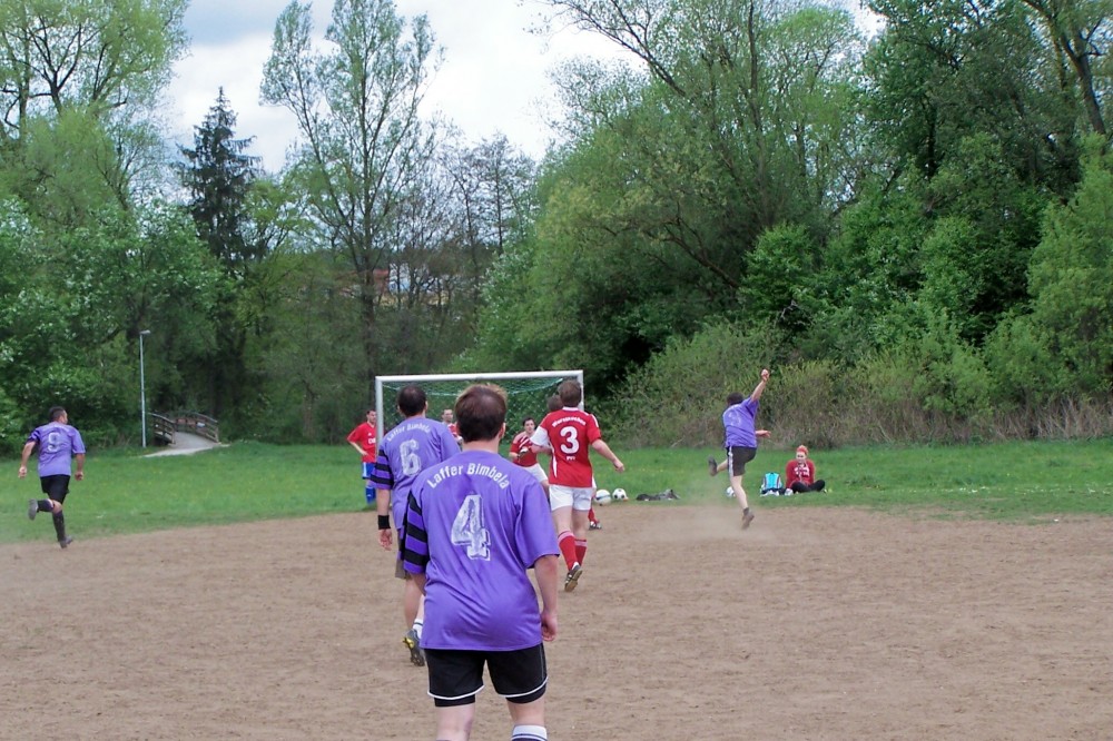Aber zurück zum Sportlichen. Nachdem das Spiel einige Minuten dahinplätscherte fasste sich der überraschend agile graue Wolf aus der Saugartensiedlung ein Herz und zog einfach mal ab. Der nicht immer sichere Torwart der „Fitzis“ ließ den Ball passieren und es hieß 1:0 durch Meußel. Fing ja gut an. Doch dann begann eine ca. 15-minutige Tiefschlafphase der Bimbela. Der Gegner bedankte sich artig mit drei blitzsauberen Treffern. Da hieß es plötzlich 1:3 aus Sicht des ältesten Teams der Liga.